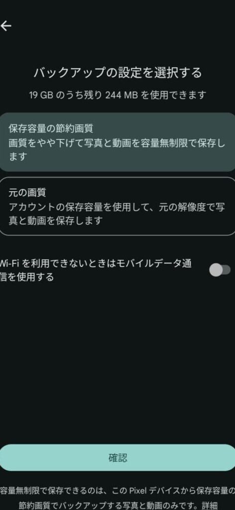 Googleフォトの設定で、「高品質」を選択することで、「容量無制限」のアップロードを可能にします。
