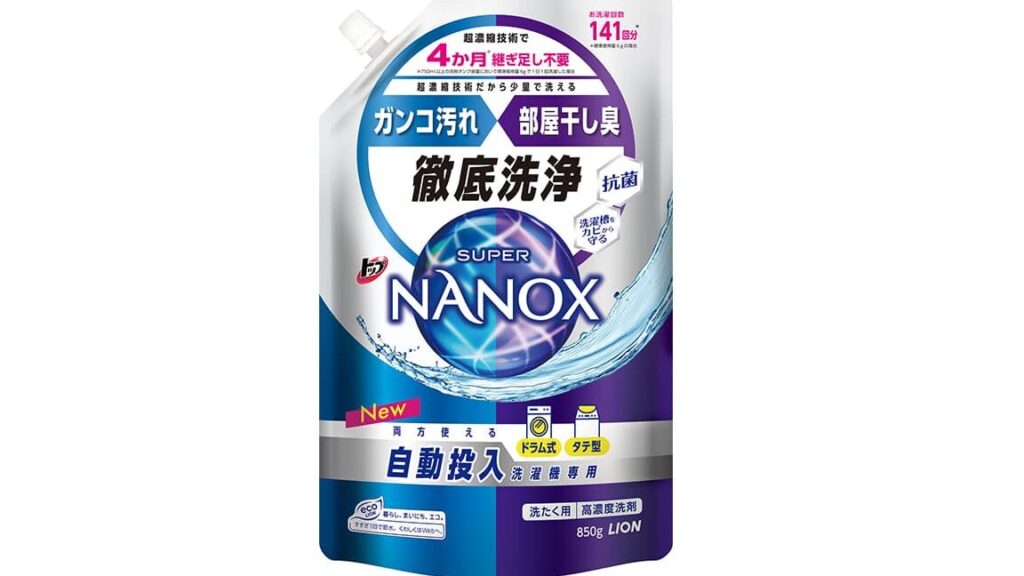 | トップ スーパーNANOX 自動投入洗濯機専用 | 超高濃度の洗剤、自動投入機能、つめかえ頻度を軽減 |