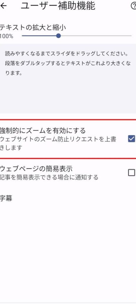 デバイスの設定により、画面上での拡大縮小が制限されることがあります。その場合、設定を確認し変更する必要があります。以下の手順を試してみてください。