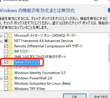 「Telnetクライアント」を選択し、「機能の有効化」を選択します。これにより、Windows 10でTelnetクライアントを使用可能にすることが出来ます。